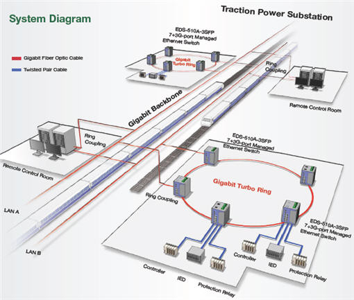 在牽引變電所之間,100臺(tái)EDS-510A-3SFP以太網(wǎng)交換機(jī)構(gòu)成了數(shù)目龐大的冗余通信環(huán)路。根據(jù)地鐵車站的分布位置,還為每一個(gè)冗余通信環(huán)路分配了不同的虛擬局域網(wǎng),從而可實(shí)現(xiàn)對(duì)每個(gè)車站段的單獨(dú)管理。為了將子系統(tǒng)集成到主系統(tǒng)中,每個(gè)冗余環(huán)配置了兩臺(tái)EDS-510A以太網(wǎng)交換機(jī),并通過(guò)環(huán)耦合技術(shù)連接千兆骨干網(wǎng)上的不同局域網(wǎng)段。EDS-510A系列交換機(jī)都支自愈技術(shù),恢復(fù)時(shí)間少于20ms,從而為電力監(jiān)控系統(tǒng)提供了隨時(shí)可用的網(wǎng)絡(luò)連接,該功能也大大增強(qiáng)了鐵路網(wǎng)絡(luò)電力系統(tǒng)的可靠性。