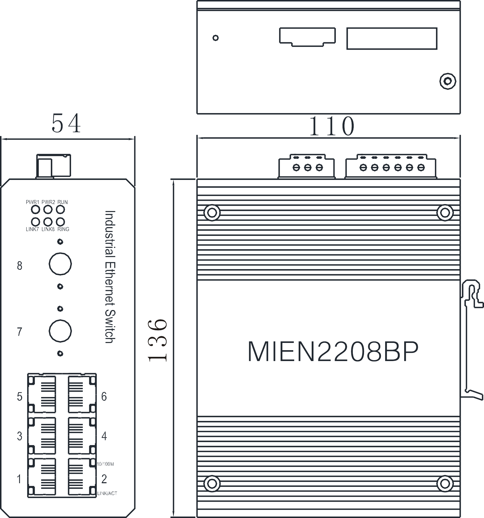 | 例如:MIEN2208BP-2TS-SC20: 2個(gè)百兆単纖雙向SC光口,傳輸距離20km,6個(gè)百兆電口,單電源DC12~48V |