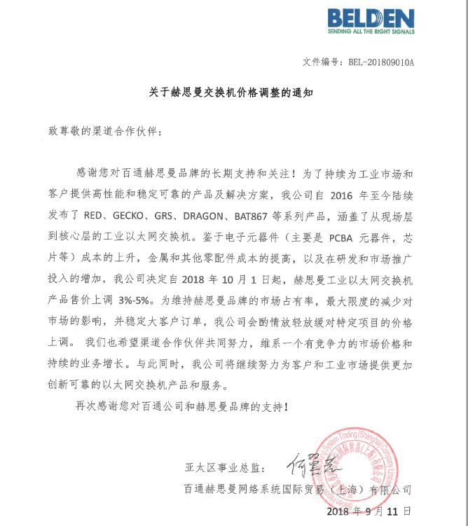 2018年關(guān)于赫思曼工業(yè)交換機(jī)價格調(diào)整通知