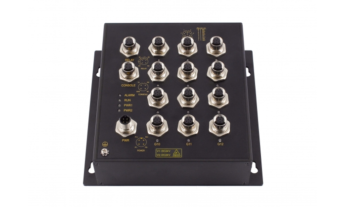 ■ 支持12個M12千兆以太網接口,一路M12繼電器告警輸出,一路M12電源接口,一路M12 Console配置接口;