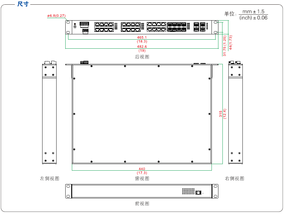 規(guī)格參數(shù) 協(xié)議標(biāo)準(zhǔn) 標(biāo)準(zhǔn):IEEE802.3、IEEE802.3u、IEEE802.3x、IEEE802.3z、 IEEE802.3ab、IEEE802.1Q、IEEE802.1p、IEEE802.1D、 IEEE802.1W、IEEE802.1s、IEEE802.3ad、 IEEE802.1x、IEEE802.3ae 協(xié)議:ARP、ICMP、TCP、HTTP/HTTPS 、Telnet、 STP/RSTP/MSTP、LLDP、IGMP、SNMPv1/v2c/v3, DHCP Server、NTP、SSH、IPV6、LACP、VLAN 三層交換技術(shù):靜態(tài)路由、RIP V1/V2、OSPF、VRRP支持路由器冗余 流控:IEEE802.3x 流控、背壓式流控 接口 光纖接口:100/1000BaseX,SFP(接口) 1G/10Gbps SFP+(萬(wàn)兆SFP口) RJ45接口:10/100/1000Base-T(X)端口,MDI/MDI-X自適應(yīng) Console口:串口調(diào)試(RJ45接口) 告警端口:3PIN接線端子,繼電器告警信息輸出 傳輸距離 超五類雙絞線:100m 光纖模塊 單模:1310nm 20/40/60Km 1550nm 80/100/120Km 多模:1310nm 2Km 交換性能 百兆轉(zhuǎn)發(fā)速率:148810pps 千兆轉(zhuǎn)發(fā)速率:1488100pps 萬(wàn)兆轉(zhuǎn)發(fā)速率:14881000pps 傳輸模式:存儲(chǔ)轉(zhuǎn)發(fā) MAC地址緩存:16K MAC緩存大?。?span style="transition-property:all;margin:0px;padding:0px;border:0px;overflow:visible;">12M 主機(jī)單播路由表:1024(IPV4),512(IPV6) 網(wǎng)段單播路由表:512(IPV4/IPV6) 背板帶寬:128G 電源需求 輸入電壓:110/220VAC(88~264VAC)/50-60Hz or 110/220VDC(88~264VDC) 本設(shè)備選用單電源輸入,可選雙電源冗余輸入 功耗 UT-63424G-16GP8GB-4XGP-BNA: 空載功率:14.5W 滿載功率:39W(Combo口為光口) UT-63424G-16GT8GB-4XGP-BNA: 空載功率:10.3W 滿載功率:24W(Combo口為光口) 機(jī)械特性 外殼:IP40防護(hù)安裝 重量:3.5kg 安裝方式:機(jī)架式安裝 機(jī)械尺寸 尺寸(W×H×D): 440mm×44mm×315mm 工作環(huán)境 工作溫度:-40℃ ~75℃ 存儲(chǔ)溫度:-40℃ ~85℃ 相對(duì)濕度:0~95%(無(wú)凝露) 行業(yè)標(biāo)準(zhǔn) EMI:FCC Part 15,CISPR (EN55022) class A EMS: IEC(EN)61000-4-2(ESD) IEC(EN)61000-4-3(RS) IEC(EN)61000-4-4(EFT) IEC(EN)61000-4-5(Surge) IEC(EN)61000-4-6(CS) IEC(EN)61000-4-8 IEC 60068-2-27(Shock) IEC 60068-2-32(Freefall) 保修期:5年